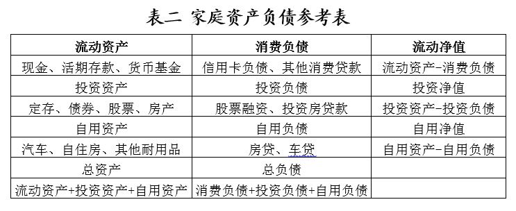 每個家庭或個人都應(yīng)有自身的資產(chǎn)負(fù)債表并定期跟蹤(可參考下表),對影響家庭資產(chǎn)負(fù)債表擴(kuò)張(收縮)或內(nèi)部結(jié)構(gòu)變化的重大事項(xiàng)(如購房、買車)要予以足夠的重視。通過與資產(chǎn)負(fù)債表相關(guān)的三個主要指標(biāo)即流動性比率、負(fù)債收入比和資產(chǎn)負(fù)債率可以監(jiān)測自身的財(cái)務(wù)健康狀況。