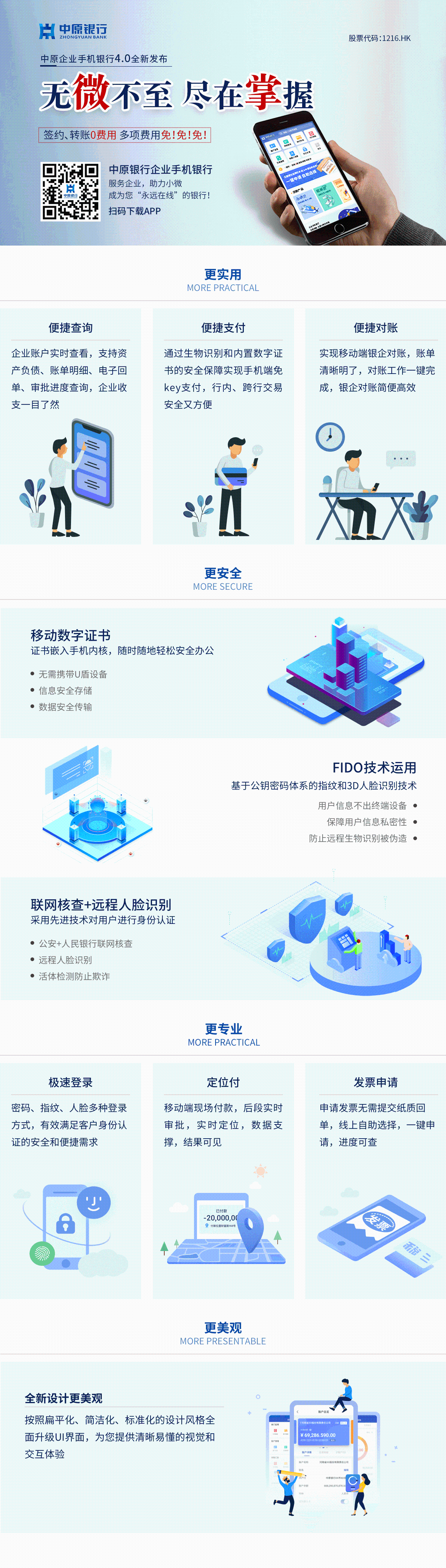 中原銀行企業(yè)手機(jī)銀行4.0面向企業(yè)客戶(hù)提供全方位、多樣化的移動(dòng)端金融服務(wù)。企業(yè)客戶(hù)可通過(guò)APP在線(xiàn)升級(jí)或應(yīng)用商店下載獲取。